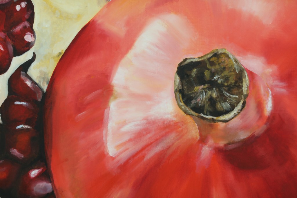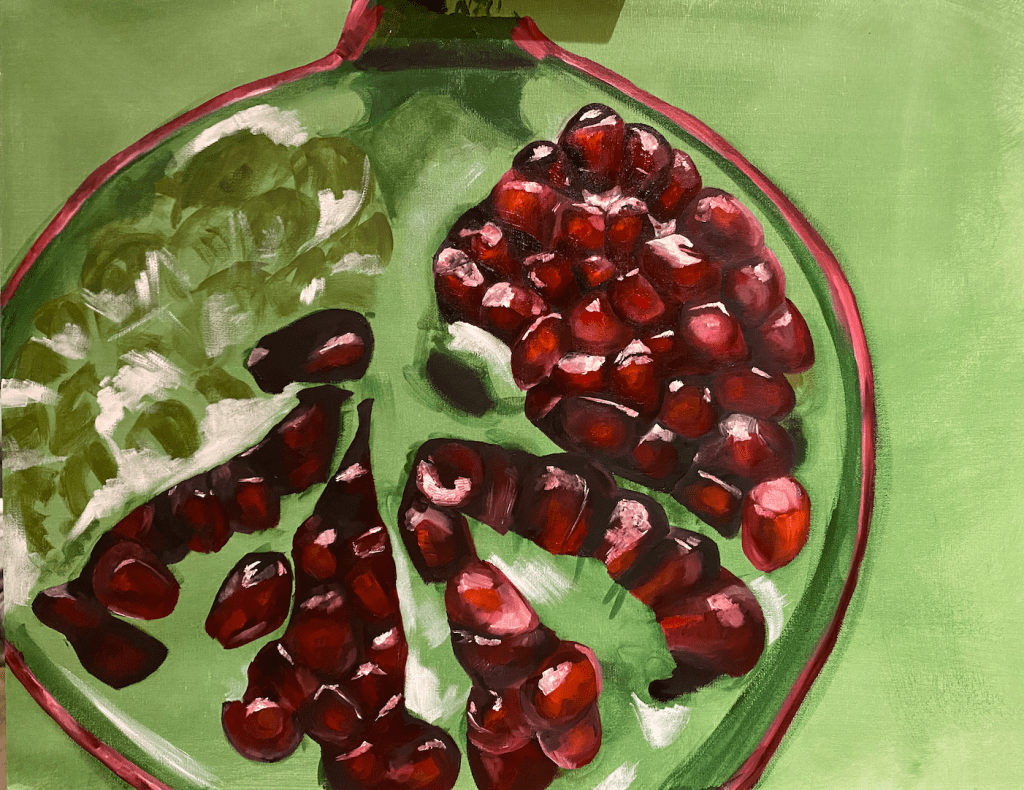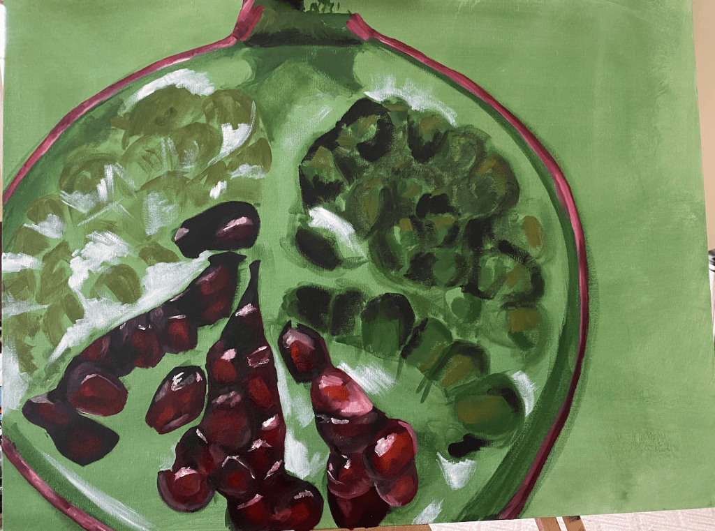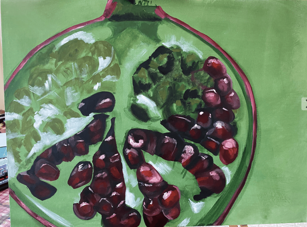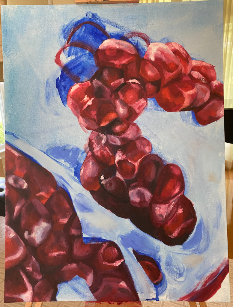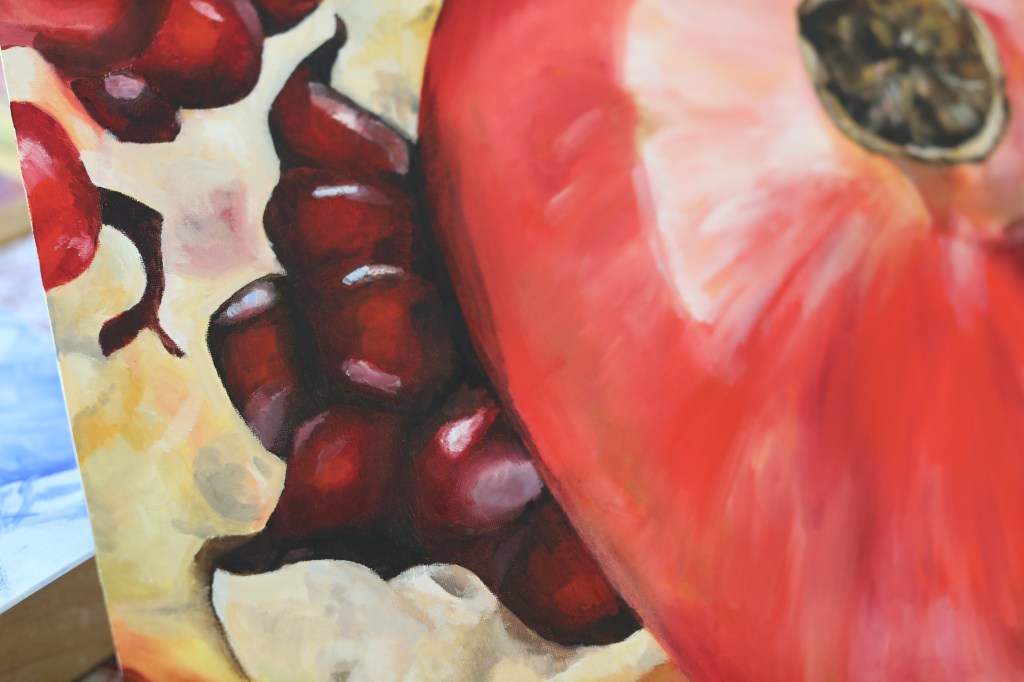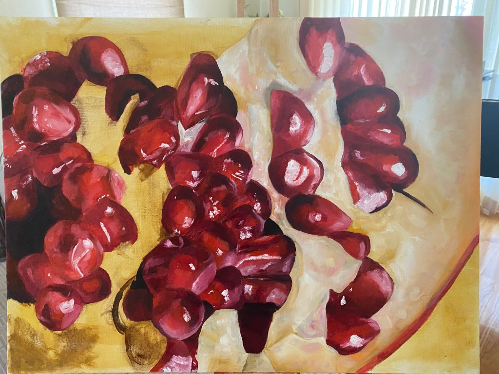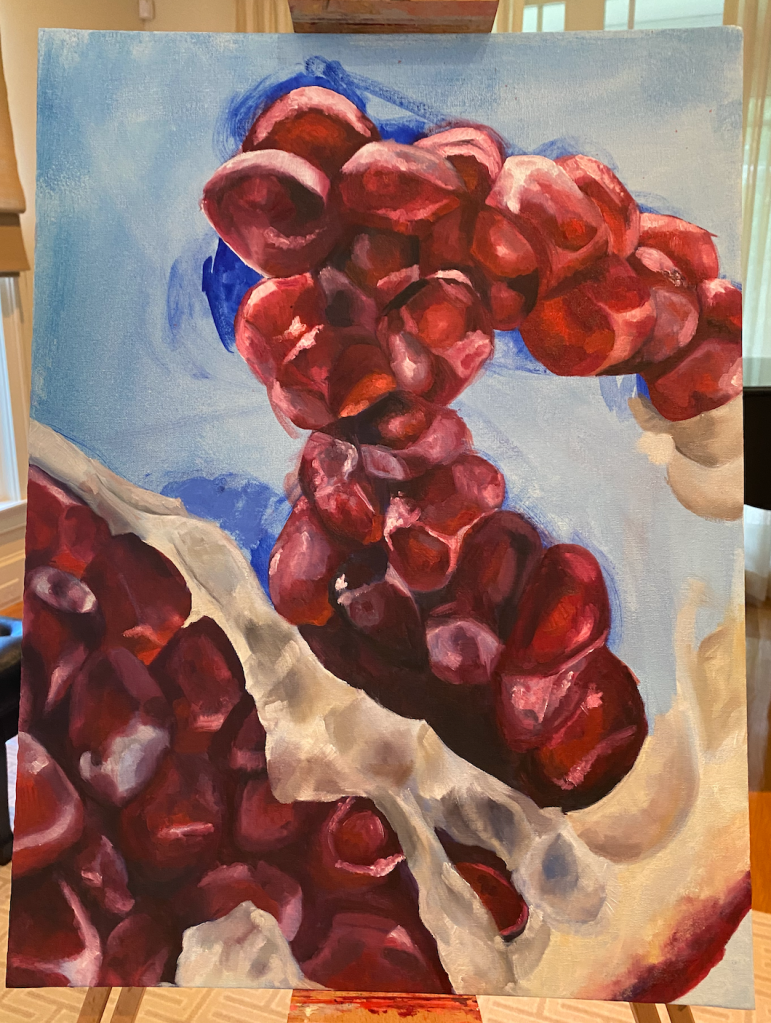 February of 2021: The first pomegranate painting I did! I did not have an underpainting for this one – instead, I outlined the pomegranate in red and began painting on the white canvas. Because this was my first time painting such an intricate fruit, I numbered each pomegranate seed on both my canvas and my computer reference image to make sure that I wouldn’t get confused with each individual seed.