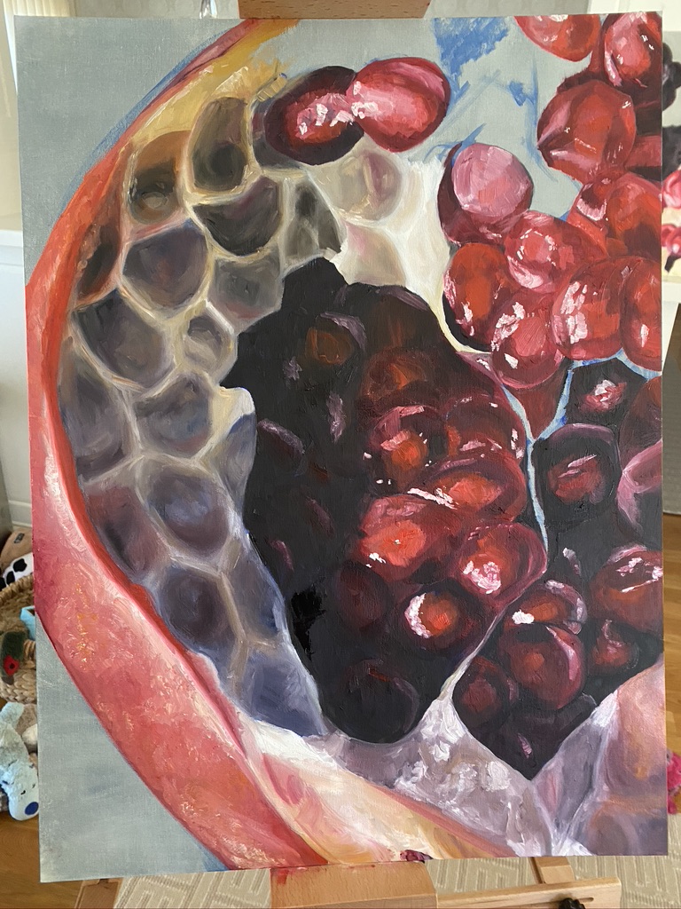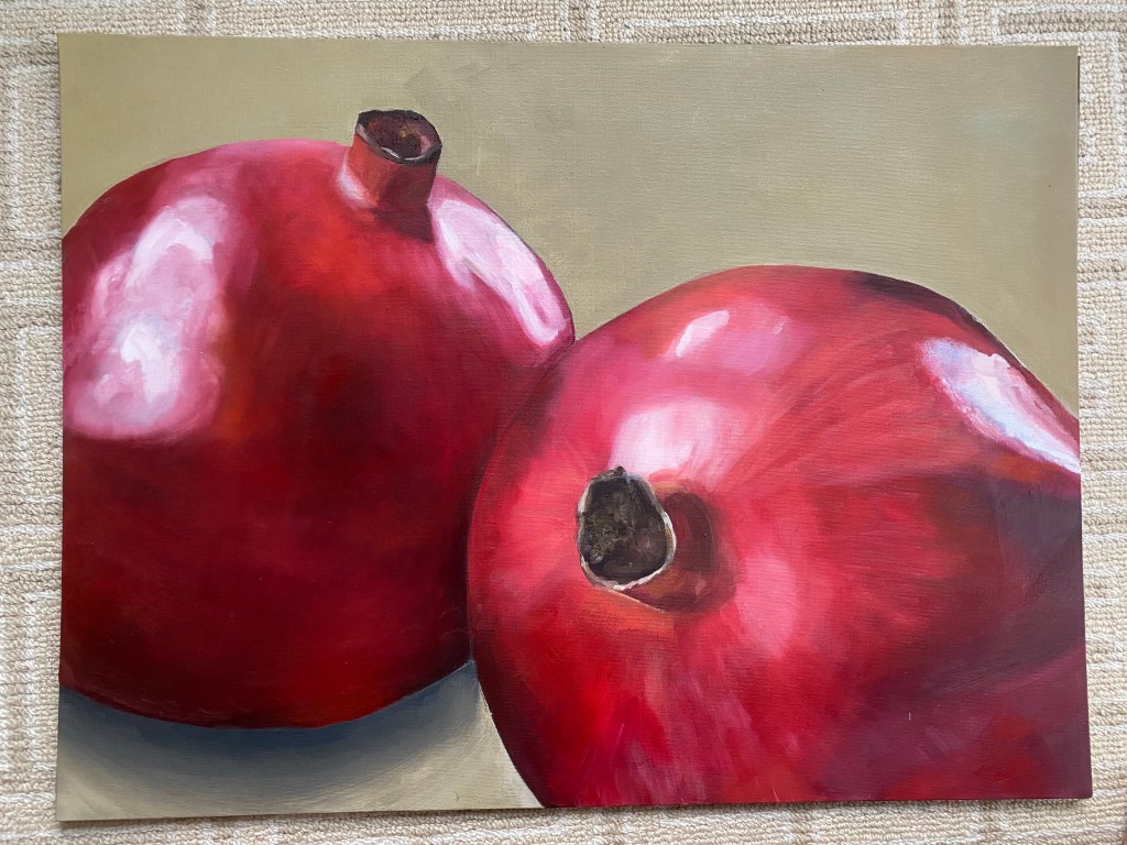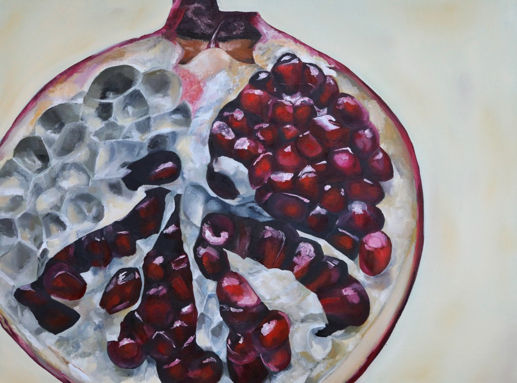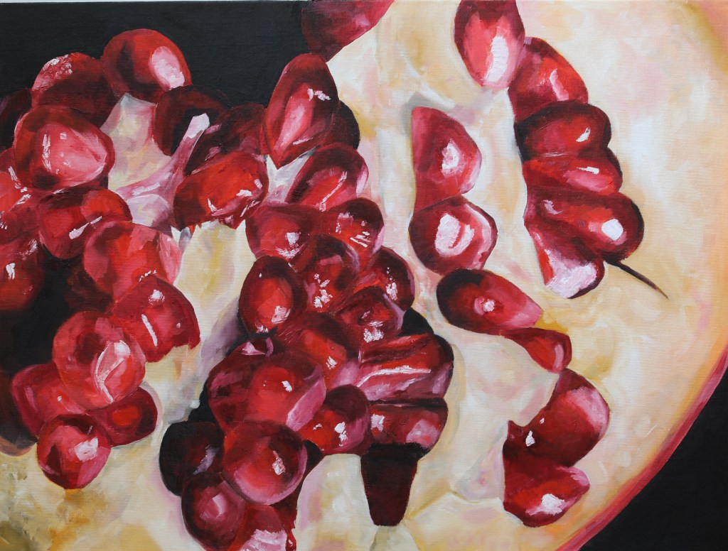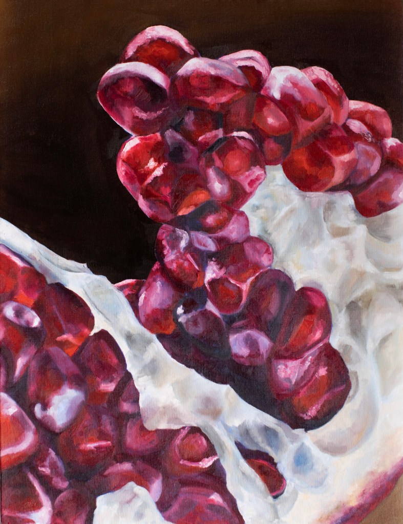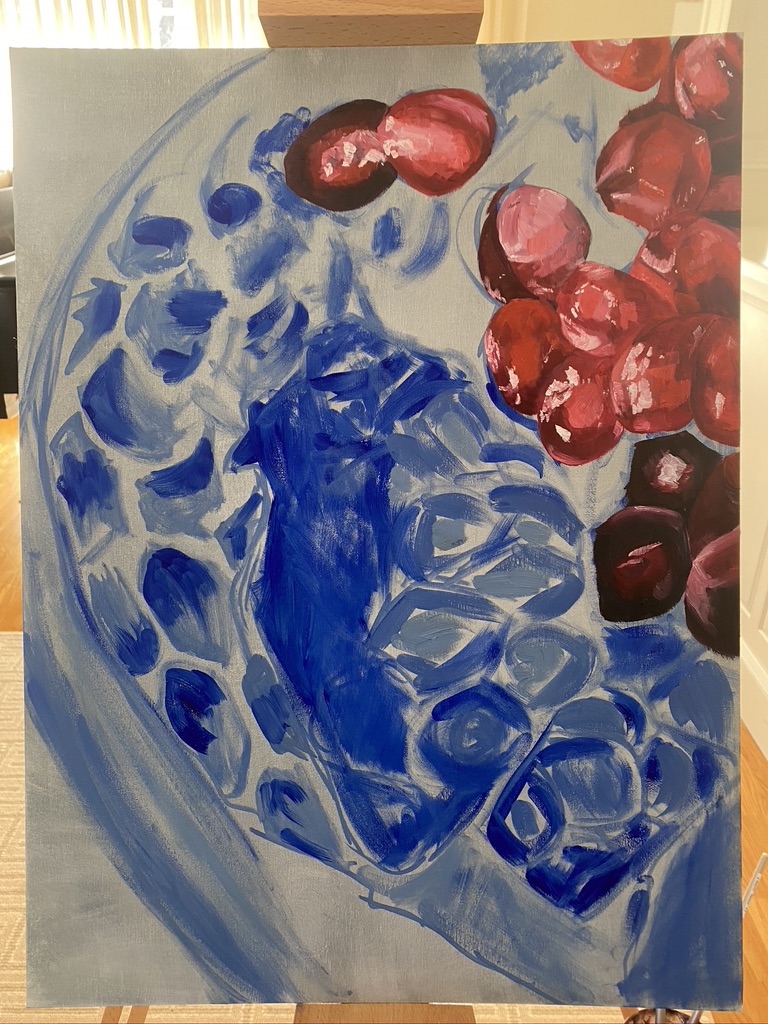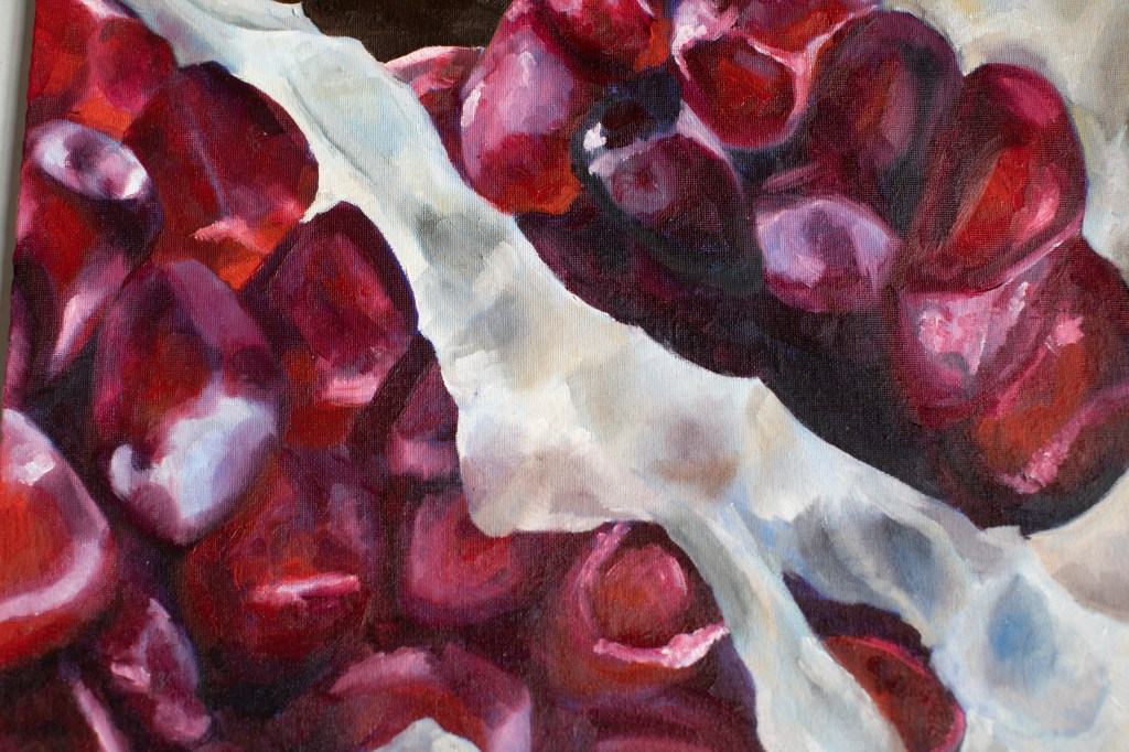 February of 2021: The first pomegranate painting I did! I did not have an underpainting for this one – instead, I outlined the pomegranate in red and began painting on the white canvas. Because this was my first time painting such an intricate fruit, I numbered each pomegranate seed on both my canvas and my computer reference image to make sure that I wouldn’t get confused with each individual seed.