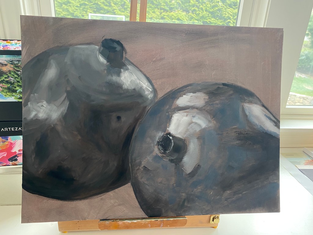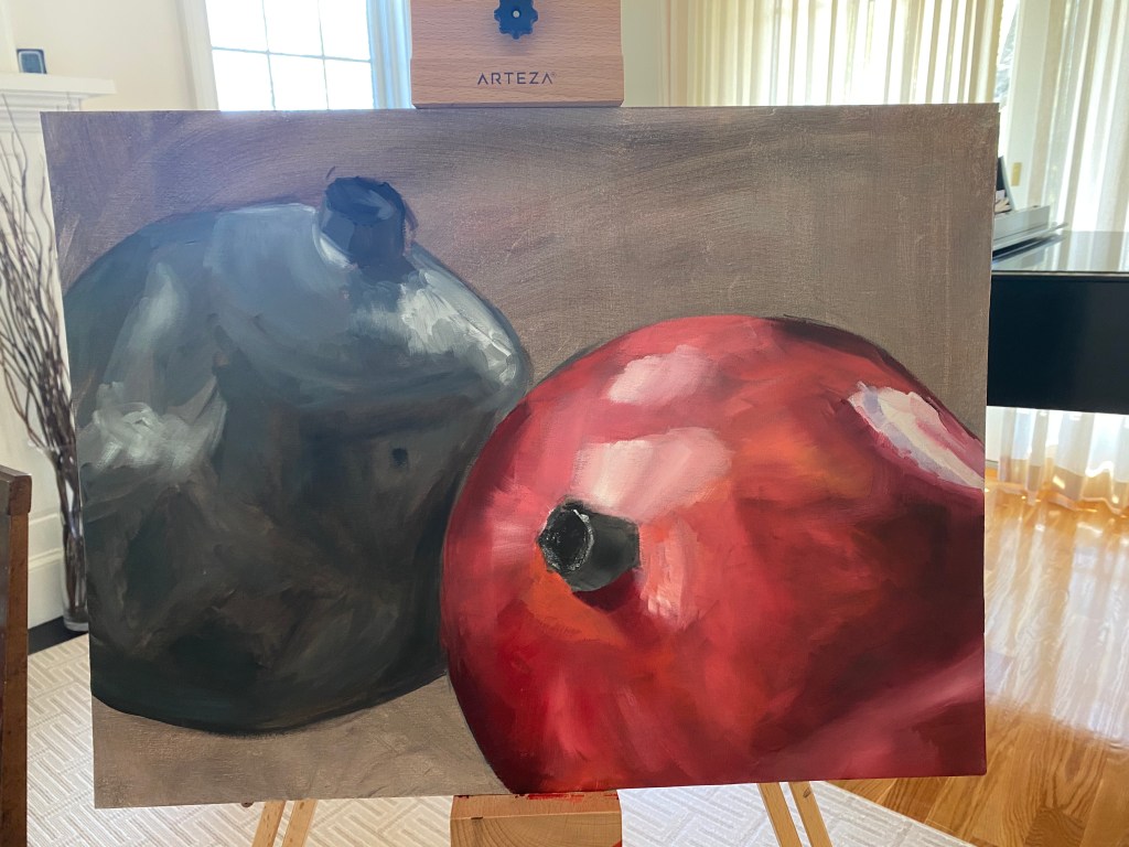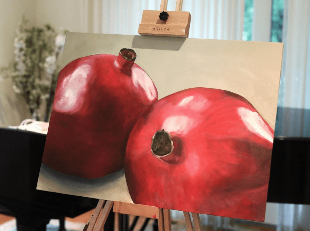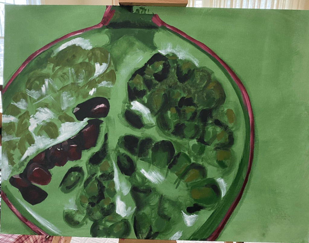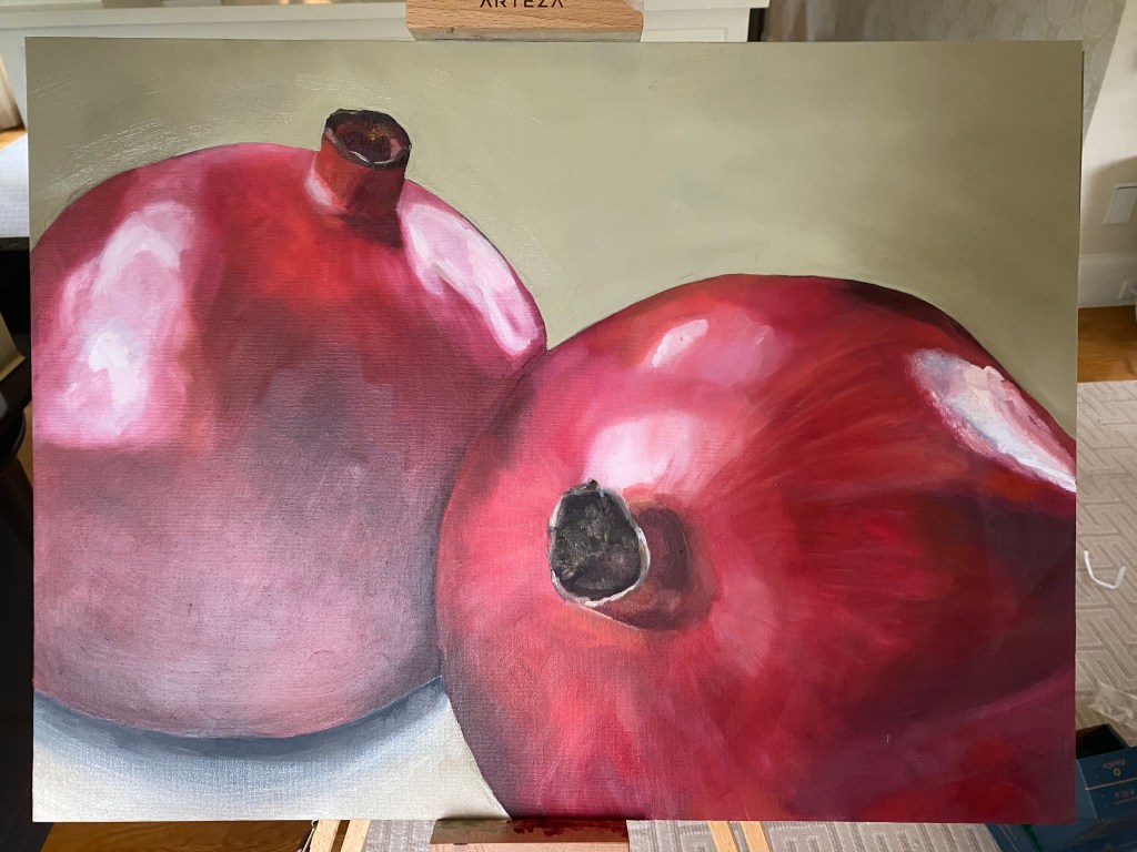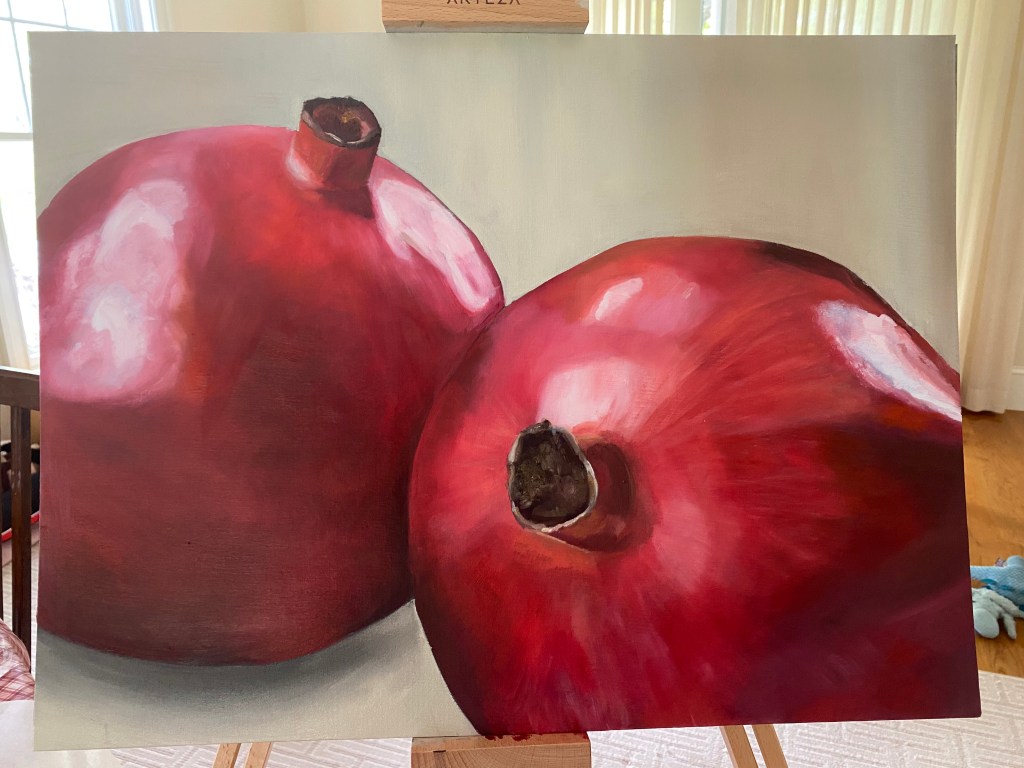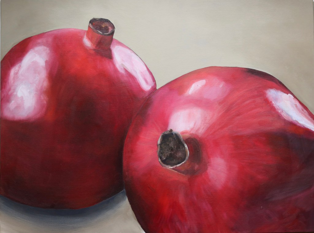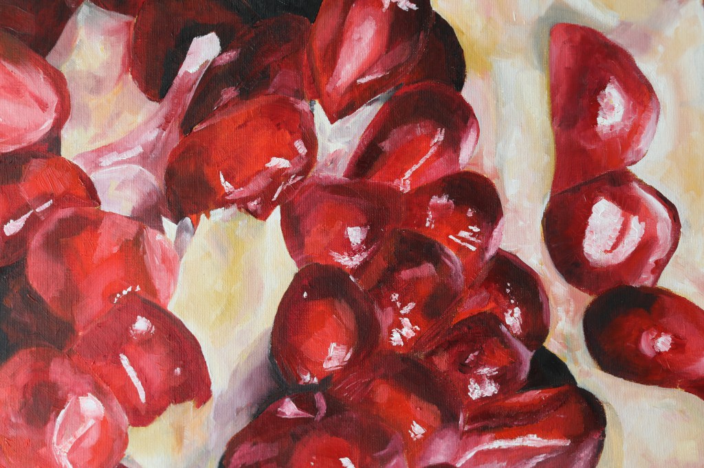 February of 2021: The first pomegranate painting I did! I did not have an underpainting for this one – instead, I outlined the pomegranate in red and began painting on the white canvas. Because this was my first time painting such an intricate fruit, I numbered each pomegranate seed on both my canvas and my computer reference image to make sure that I wouldn’t get confused with each individual seed.