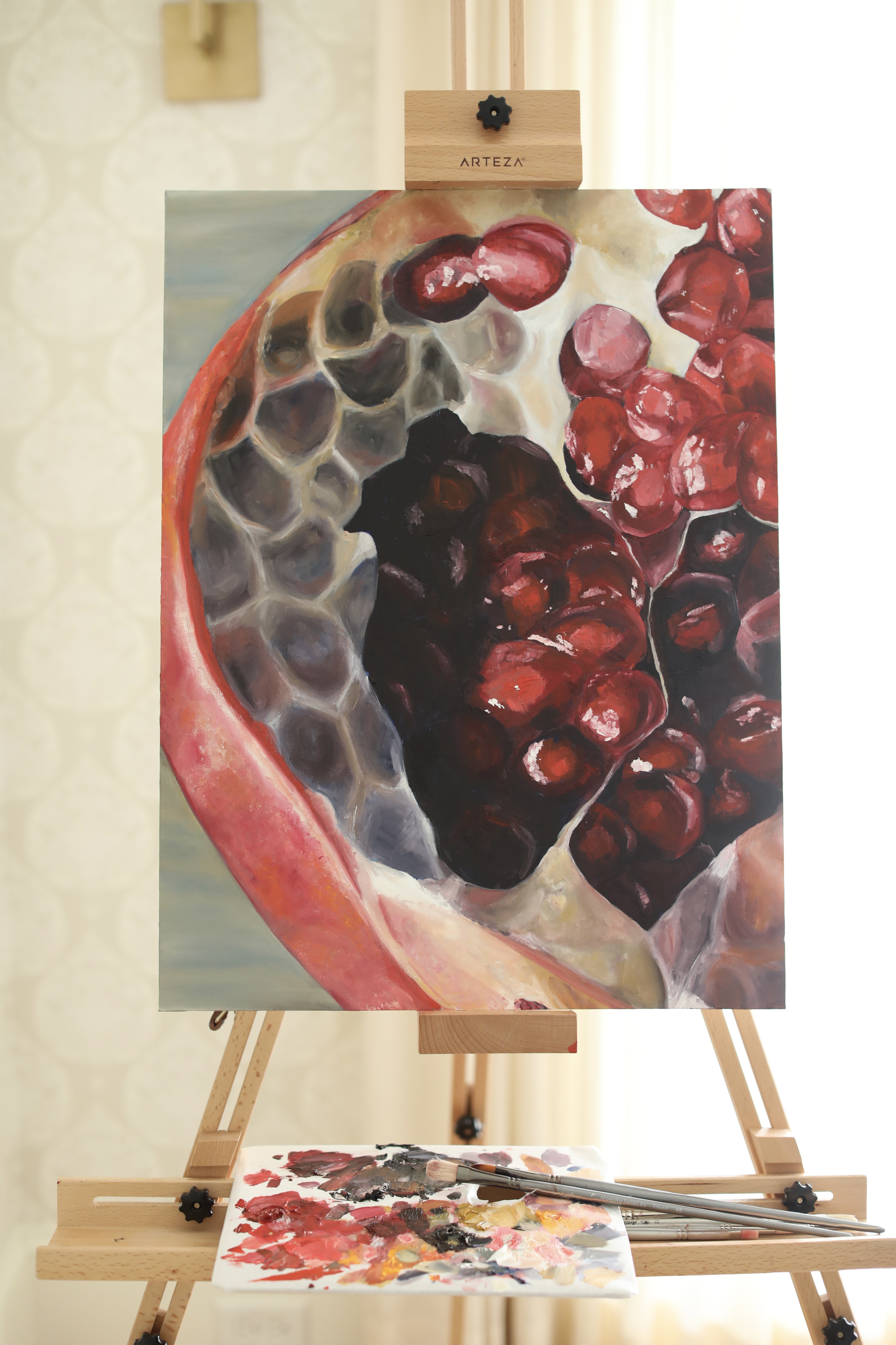 May of 2021: The first painting of the outer pomegranates and the only painting without any seeds! This was definitely a tough one and I did not have as much fun with it (I got so attached to painting each individual seed), but I’m pretty happy with how it turned out. I began with a paynes grey underpainting and initially made the stems way too small. After I was satisfied with the actual pomegranates, I had a really hard time with the background. (look at the slide show!) The first background was a little too curtain-y; the second was a little too flat. The third background was way too dark, and so I returned to the colors of the initial background (without the impression of a curtain).