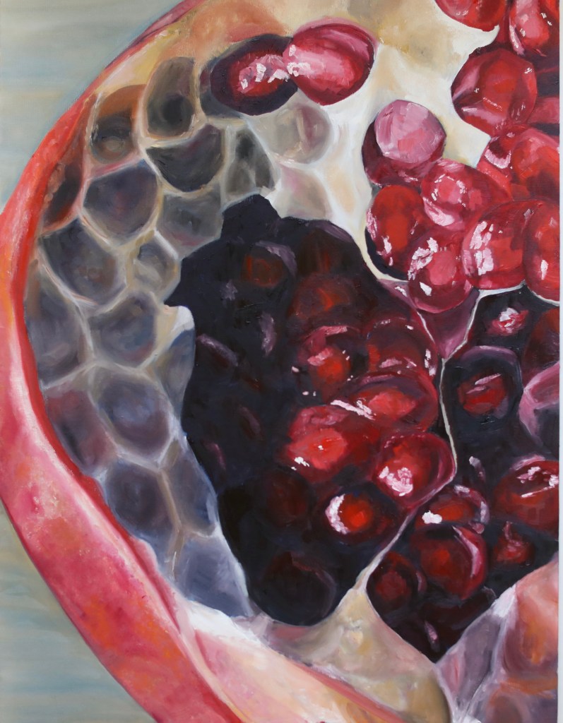 My first body of work! This series of seven pomegranates was done all on 18 x 24 canvas boards with Winsor and Newton water mixable oil paints. I experimented with different underpainting styles & colors, different parts of the pomegranates (ranging from the seeds to the spherical shape of the outer fruit), different scales of the seeds, and different backgrounds. I hope you enjoy!
